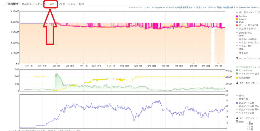 Keepaの拡張機能を入れている場合、商品ページの下の方にKeepaのグラフが表示されます。