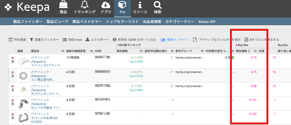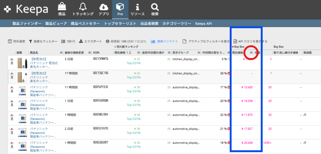 この項目の順番は設定によって異なるので、みなさんと違うと思いますが、商品の金額(BuyBox価格か新品価格)の列を探してください。